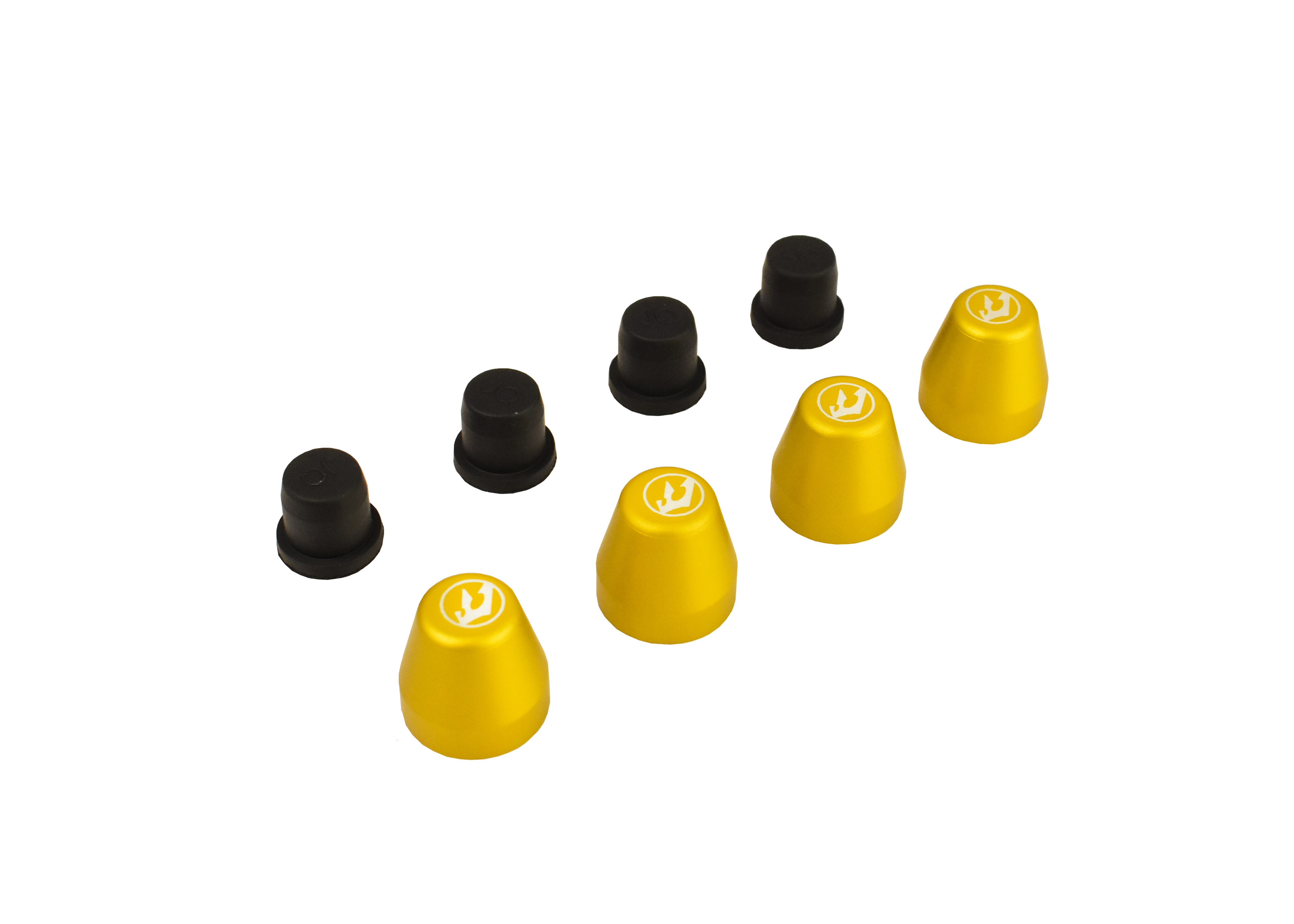 Machined out of 6061 billet rod and using a rubber bushing to hold the cover in place. This cover is both attractive and functional. Available as a set of 4 to handle front and rear calipers and front master cylinder. The cap is available in 5 anodized colors black,blue,red,gold and silver with the driven logo etched on top.