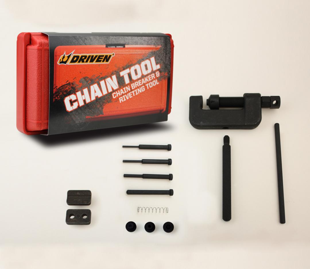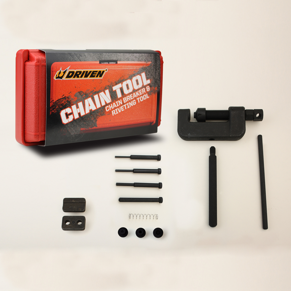 This new tool has everything you need to not only break your chain, but also to rivet your new one. All replacement parts are readily available should you need any. Tool includes everything you need to break and rivet most 520/525/530 chains.