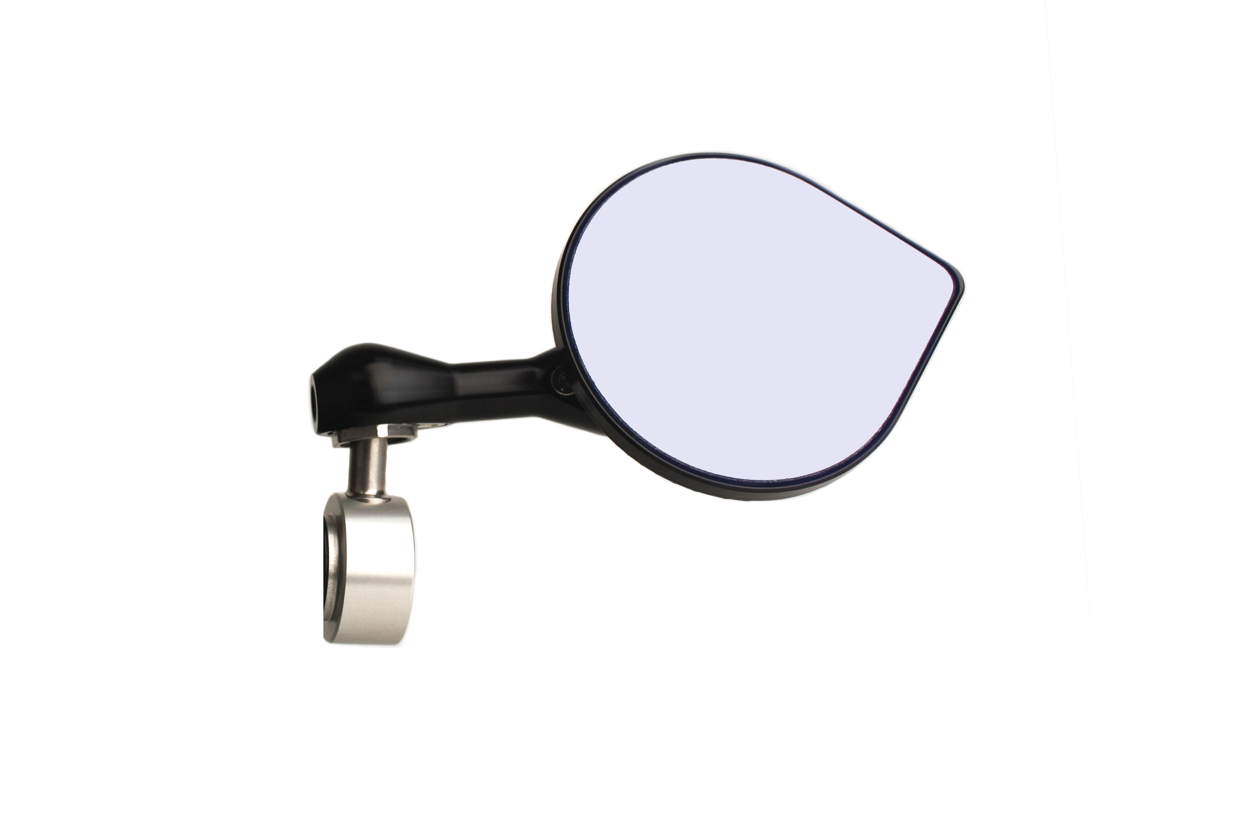 The 3D tool path on the back of the mirror gives it a look like no other. It features a high-end made in America blue tinted convex glass that offers a wide field of view. The stainless steel pivots allow you a wide range of adjustment, or you can flip it in for running in tight traffic.