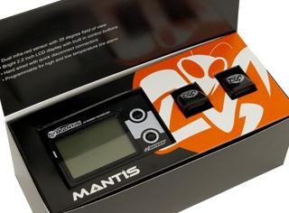 The Mantis Infrared Temperature Sensor by DRIVEN Racing. The Mantis non-contact infrared sensor utilizes a 17 bit analog to digital converter and a powerful digital signal processing unit. With a resolution of 0.02°C, the Mantis sensor is a highly precise measuring instrument. A proprietary lens serves to create a wide-angle field of view for the sensor to observe infrared radiation emitted from the tires surface. Additionally, the lens protects the sensor from being damaged by road debris. Encapsulating the senors electronic component assembly is a durable injection-molded polycarbonate housing. The Mantis display unit houses a glare-free liquid crystal display and a processor capable of converting raw data from the thermal sensor into valuable human-readable information, in real time. Programmable alerts can be easily set, and are useful in alerting the rider when his/her tire temperatures exceed the desired range.