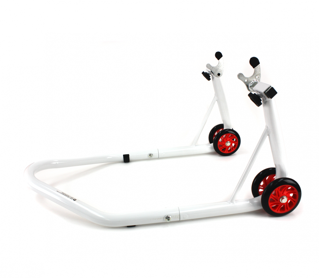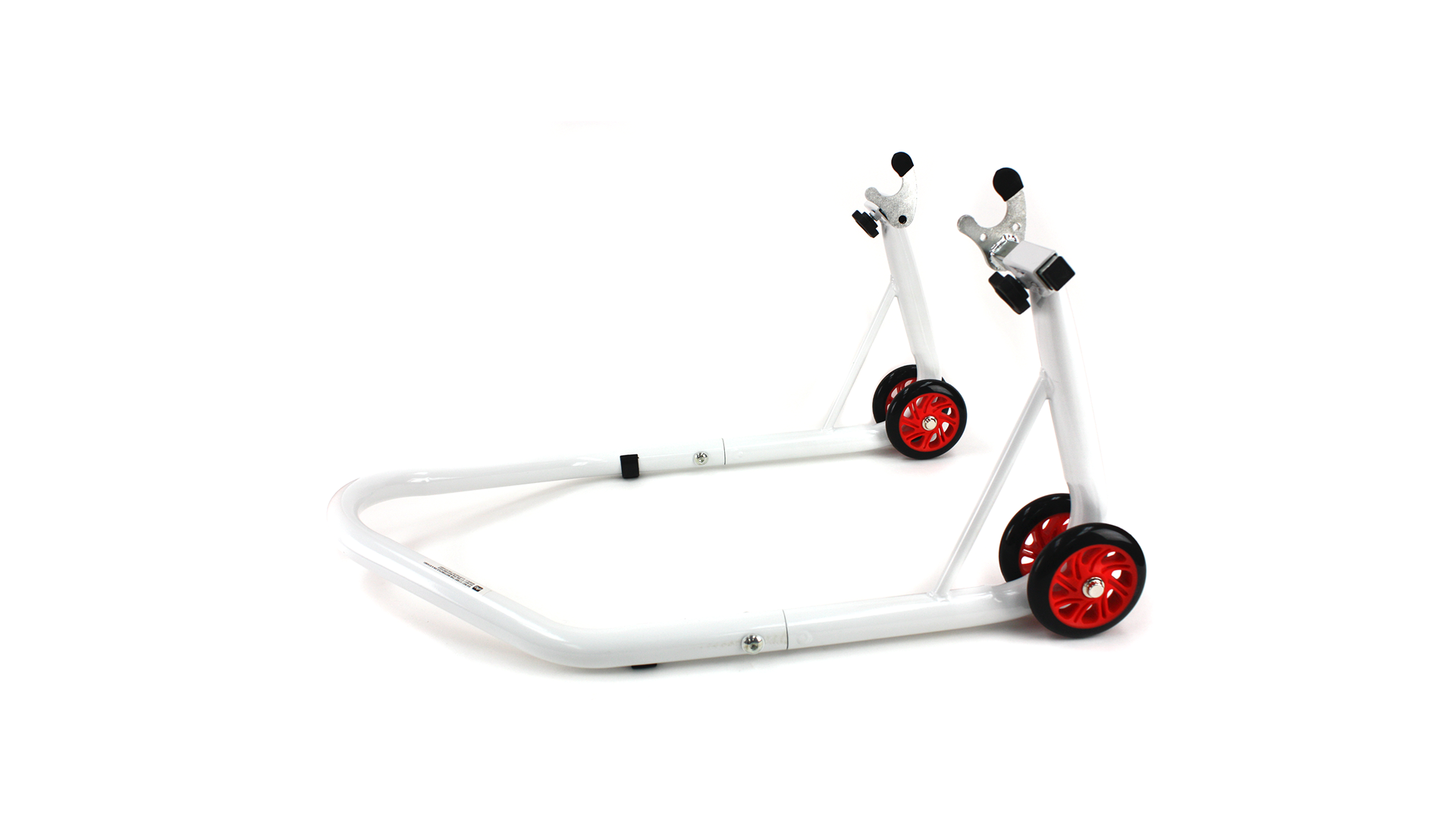 All stands are constructed from heavy duty steel to enhance strength stability, and still be a light weight design package. All stands are white powder coated to improve weather resistance. They're properly angled, design to insure easy lifting and dismount of your bike. Quad plastic/rubber wheels with sealed bearing are standard on all our stand for smooth and stable rolling on all surfaces. Plastic knobs are provided for easy adjustment of front and rear stands. The Front Head Lift Stand comes with 5 pins to fit most street bikes on the market today. All hardware is zinc plated to eliminate corrosion, and to enhance stand life. All stands come with installation instructions, and are packed flat for low cost shipping.