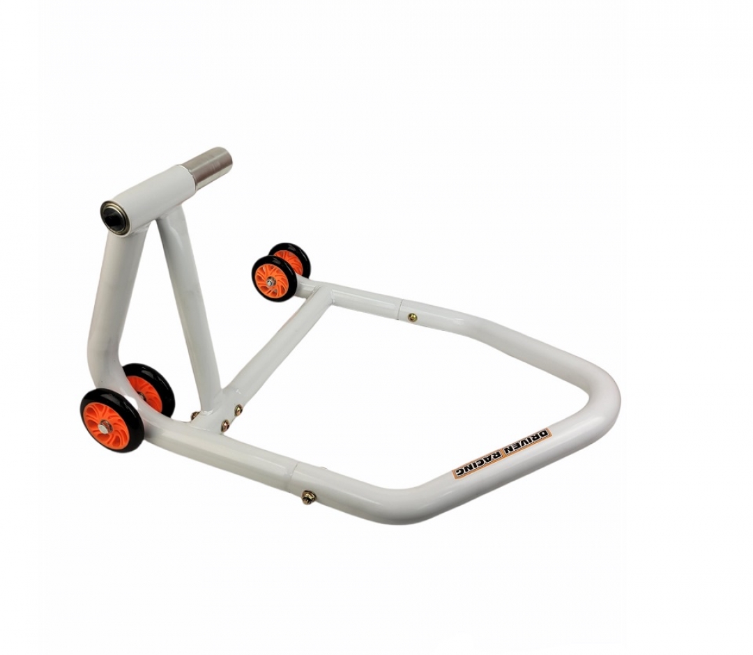 All stands are constructed from heavy duty steel to enhance strength stability, and still be a light weight design package. All stands are white powder coated to improve weather resistance. They're properly angled, design to insure easy lifting and dismount of your bike. Quad plastic/rubber wheels with sealed bearing are standard on all our stand for smooth and stable rolling on all surfaces. Plastic knobs are provided for easy adjustment of front and rear stands. The Front Head Lift Stand comes with 5 pins to fit most street bikes on the market today. All hardware is zinc plated to eliminate corrosion, and to enhance stand life. All stands come with installation instructions, and are packed flat for low cost shipping.