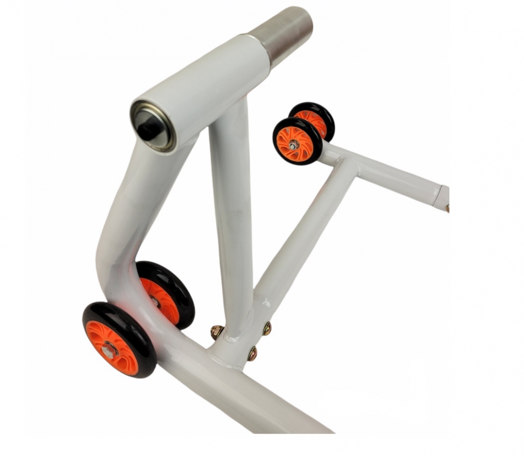 All stands are constructed from heavy duty steel to enhance strength stability, and still be a light weight design package. All stands are white powder coated to improve weather resistance. They're properly angled, design to insure easy lifting and dismount of your bike. Quad plastic/rubber wheels with sealed bearing are standard on all our stand for smooth and stable rolling on all surfaces. Plastic knobs are provided for easy adjustment of front and rear stands. The Front Head Lift Stand comes with 5 pins to fit most street bikes on the market today. All hardware is zinc plated to eliminate corrosion, and to enhance stand life. All stands come with installation instructions, and are packed flat for low cost shipping.