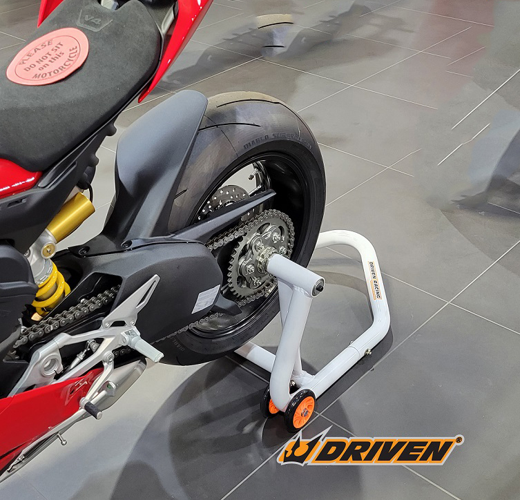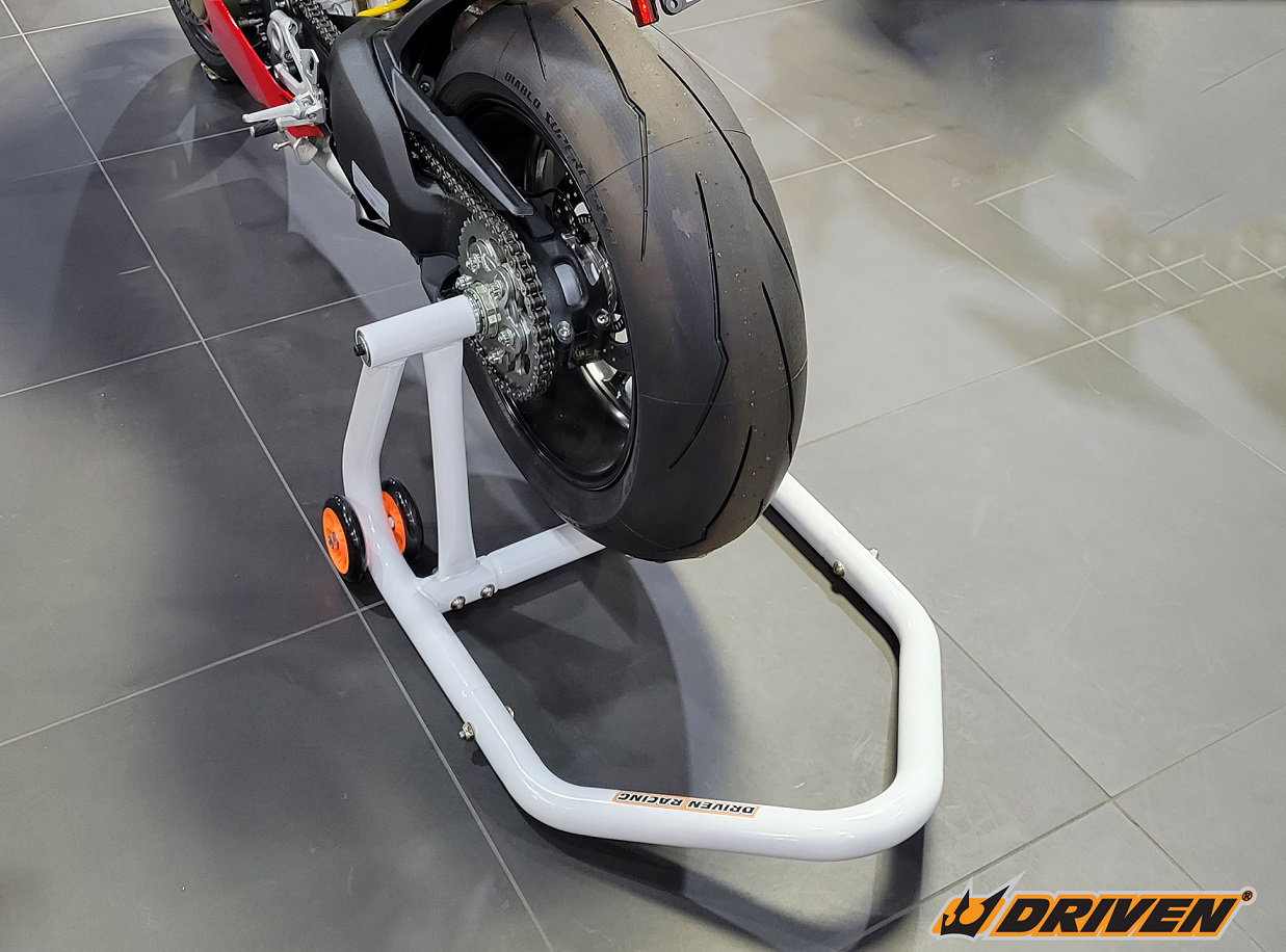 All stands are constructed from heavy duty steel to enhance strength stability, and still be a light weight design package. All stands are white powder coated to improve weather resistance. They're properly angled, design to insure easy lifting and dismount of your bike. Quad plastic/rubber wheels with sealed bearing are standard on all our stand for smooth and stable rolling on all surfaces. Plastic knobs are provided for easy adjustment of front and rear stands. The Front Head Lift Stand comes with 5 pins to fit most street bikes on the market today. All hardware is zinc plated to eliminate corrosion, and to enhance stand life. All stands come with installation instructions, and are packed flat for low cost shipping.