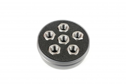 Stainless steel sprocket nuts are machined out of 306 Stainless Steel and have the logo engraved on the top together with the torque settings. Titanium sprocket nuts are made of G-5 Titanium and have engraving on top with our logo and torque settings and are pre drilled for safety wire. . Both nuts are M10 X1.25 pitch.