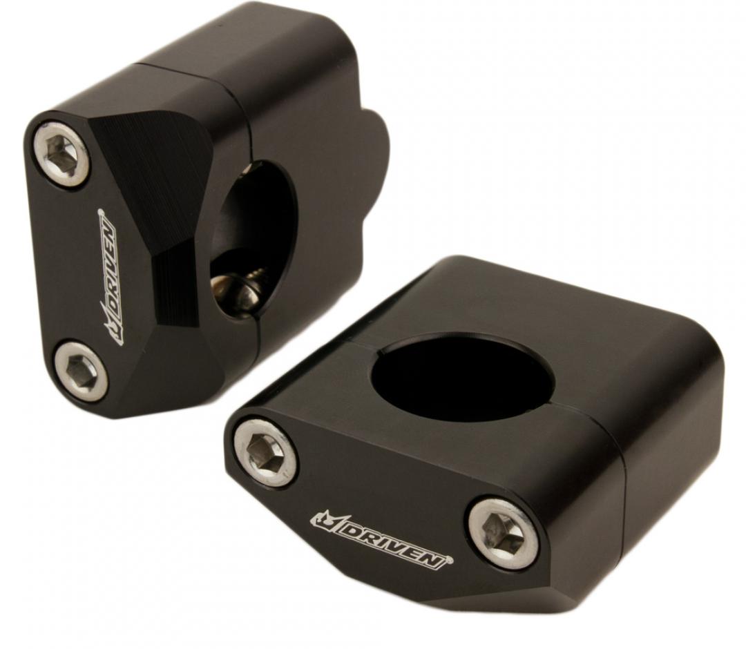 Machined from 6061 billet aluminum and then anodized in beautiful black. These universal bar mounts will fit directly into any 7/8" perch allowing the use of any 1 1/8" (fat bar) handlebars. There are two height options available as well, regular or high. These mounts have either a .75" rise or a 1.25" rise for the high version.
